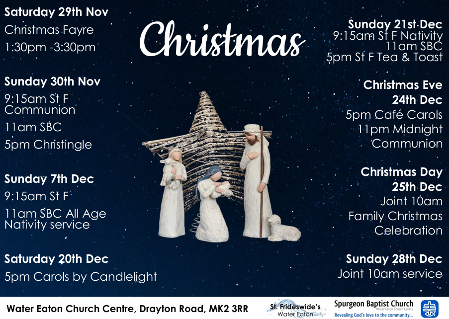 The Christmas season is here! Explore the links below to find out more about the Christmas events and services which are being held at the Water Eaton Church Centre this year, organised both by us and St Frideswide’s. All are welcome!