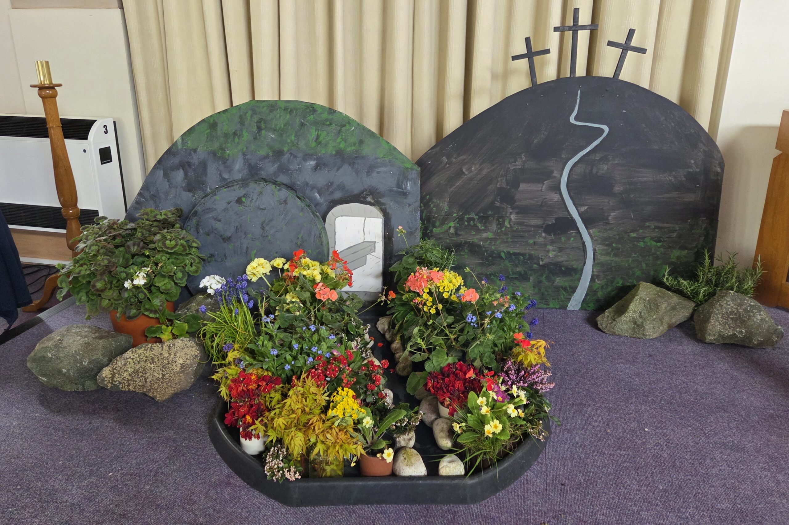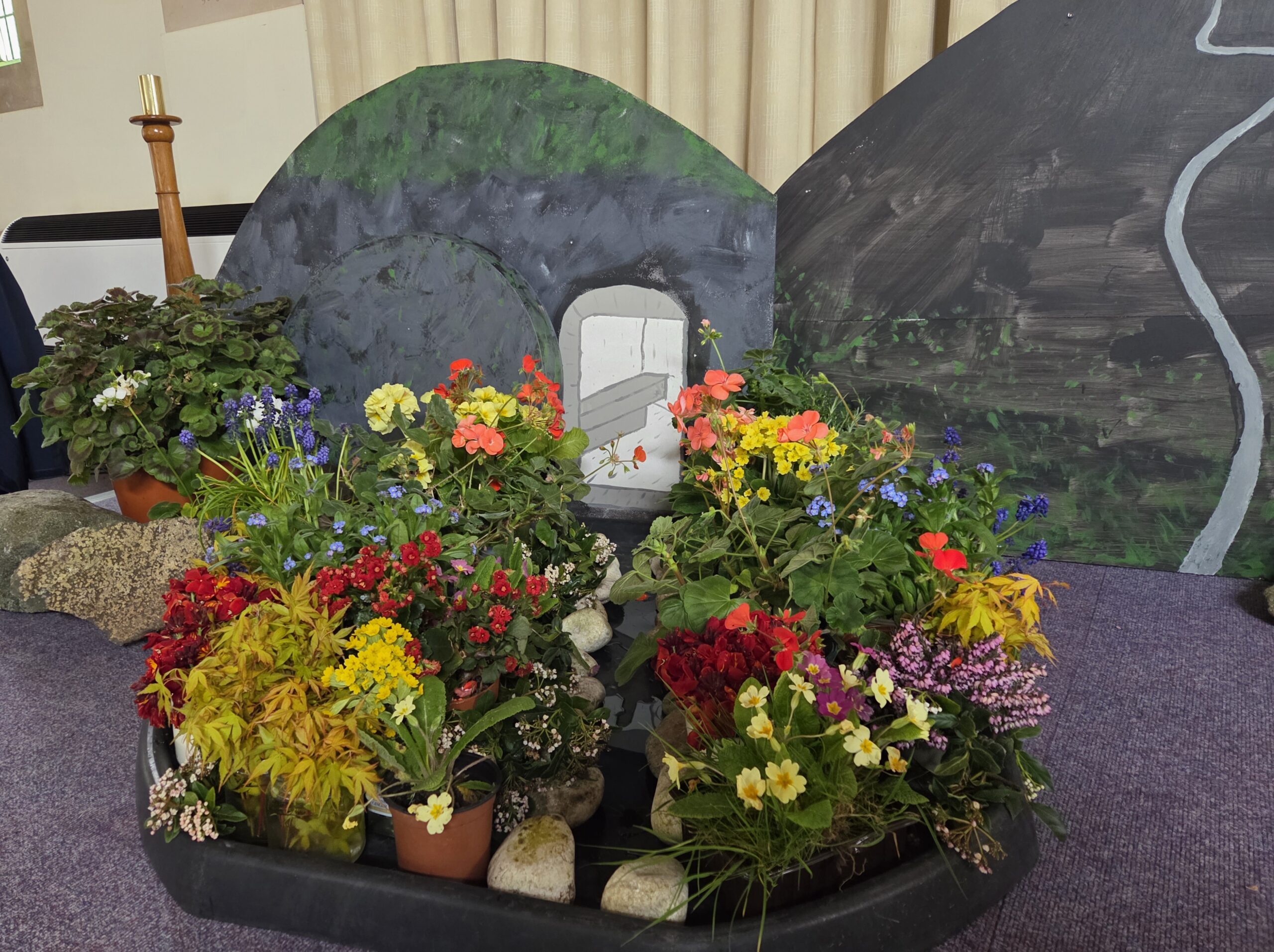 Today the church is being prepared for tomorrow’s celebration of Easter Sunday, with a colourful array of flowers being brought in to brighten the Easter garden display. We can rejoice at the empty tomb with the stone rolled away, as it points us to Christ’s resurrection from the dead.