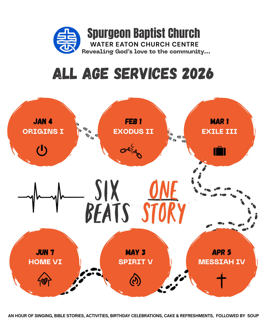 For the first half of 2026, our all age services will be centered on the theme ‘Six Beats One Story’. Through creative material provided by the Bible Society, we will go through the whole Bible story in just six scenes!